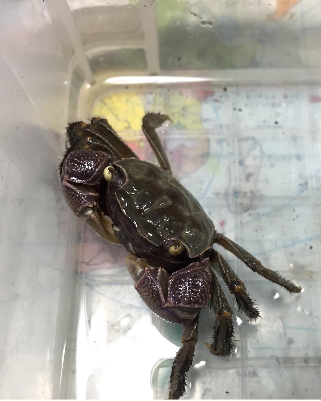 写真のカニはクロベンケイガニなのですが、当時はチニングの存在も知らず、造形とカラーリングのかっこよさに魅かれて飼っていました(あらためて冷静に見ても、紫のウデと黄色い目が超かっこいいと思う)。