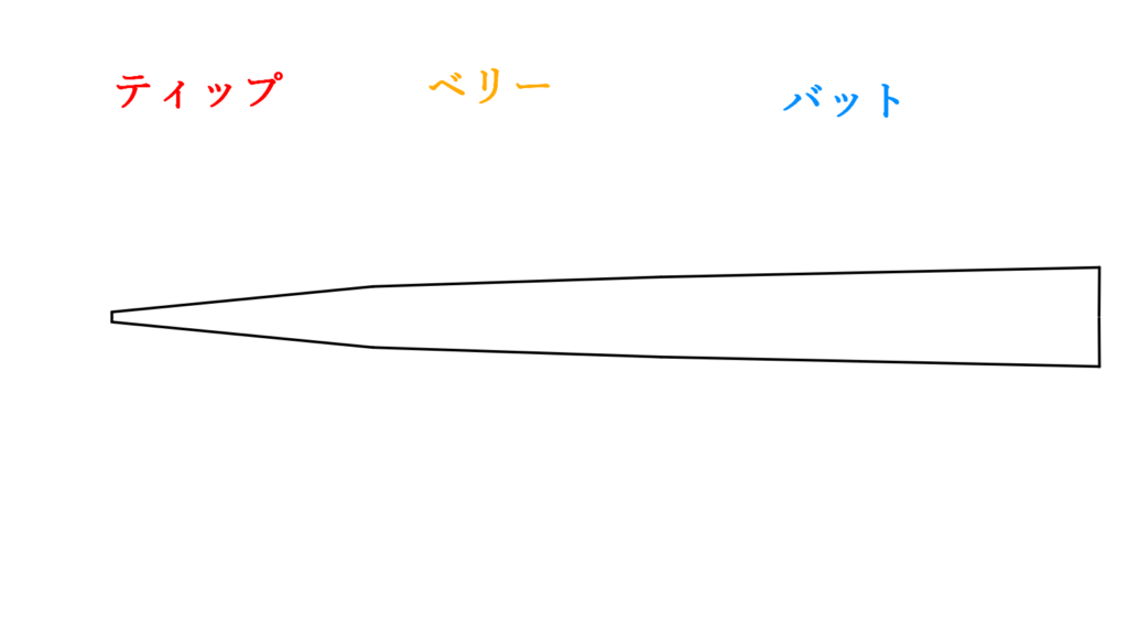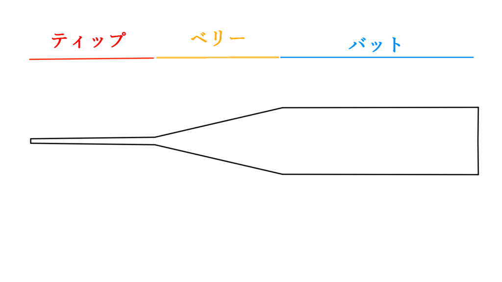 非常に大げさな表現ですが、このような三段テーパーに思えました。ティップのテーパーはかなり手前まで寝ており、ベリーで急激に立ち上がって、バットは平行な感じ…