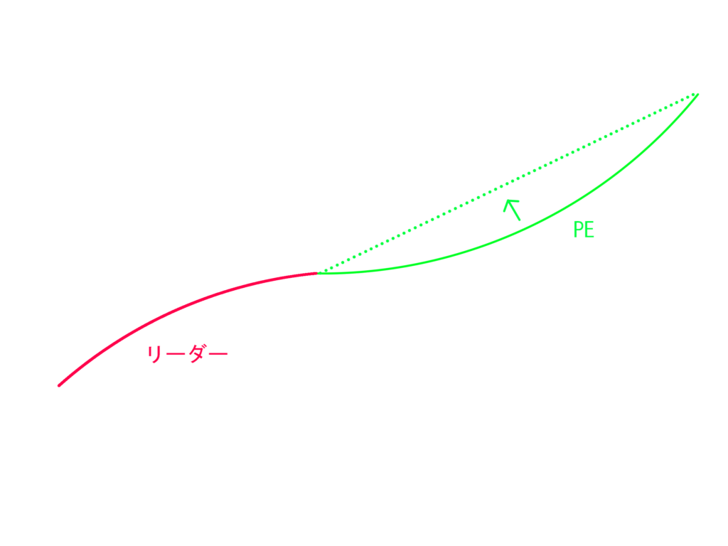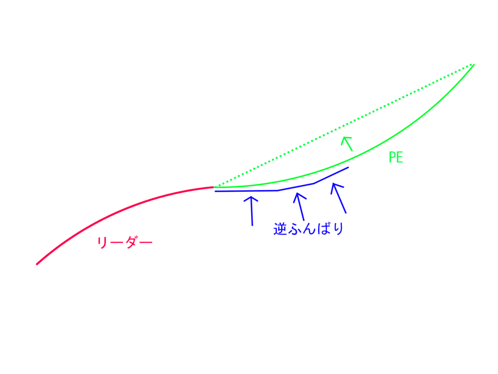 今までの話は、リーダーのないシステム、かつ「すべてのラインの比重が1.00超であること」を暗黙の前提にしたお話でした。しかし残念ながらPEラインの比重は0.98であり、先端にリーダーを結ぶことが極めて一般的です。これにより、軌道はS字になり、起きる現象はさらに複雑になります。