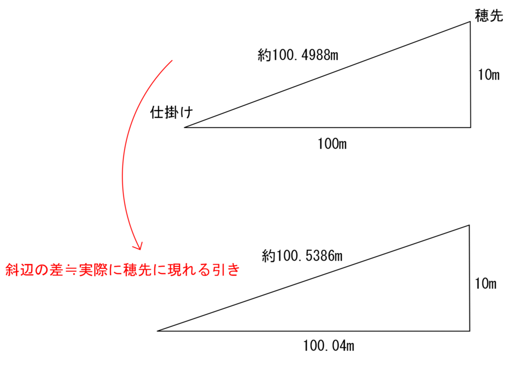 ラインには伸び率があります。遠距離ほど伸びの影響を大きく受け、アタリの減衰も大きくなります。