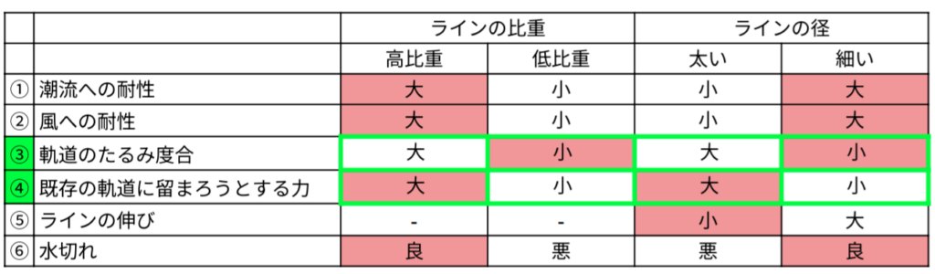 風になびかれるラインの挙動も、上記の潮の影響に近い特性があります。風が強い日であれば、風になびかれて軌道が上ずる現象に対し、重いラインは自ら軌道を下方向へ補正するので、軌道だけ見れば素直になりやすいです。