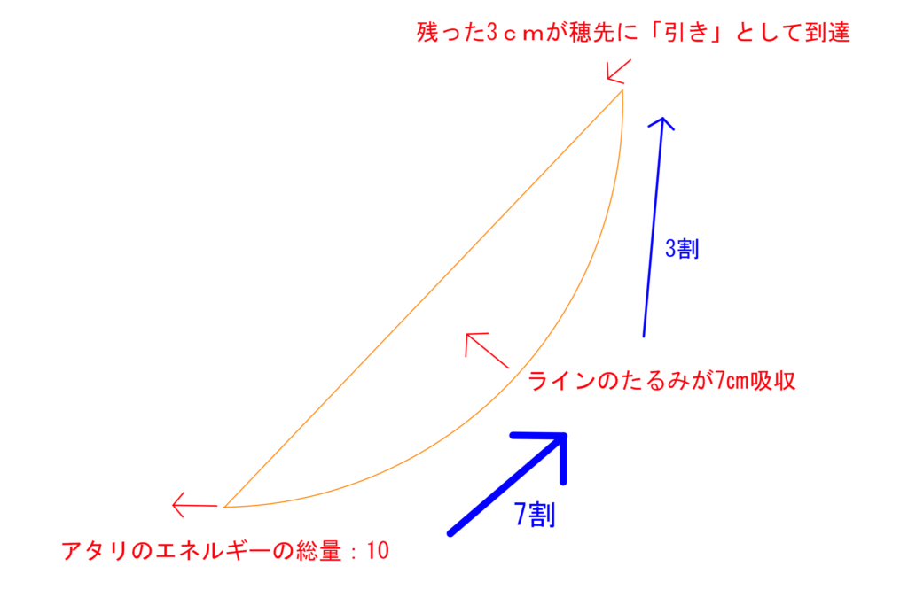実際にアタリがあった際には、そのエネルギーが「たるみを張る力」と「穂先を引っ張る力」に分解されます。