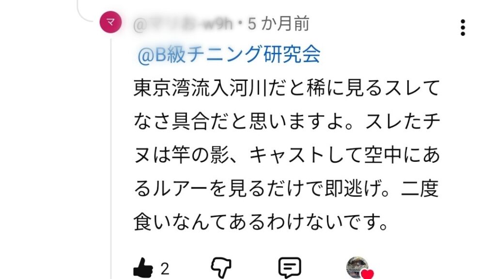 特にこの御二方は、私の投稿した動画に限らず、あらゆるチニング動画のコメント欄で積極的に活動されており、動画内で取り上げられているアングラーの力量否定について、大変尽力されています。