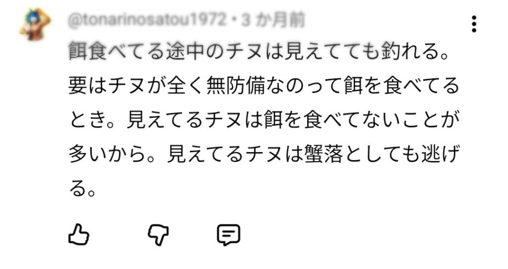 「カニを落としても逃げる」と仰っていますので、チヌのなかば上方から餌を落とすようなアプローチをしていることが窺えます。しかし、見えチヌと呼ばれるようなサイズ感のチヌは、ほぼほぼ水中に敵はおらず(GTやオオメジロザメが河川に入るような南西諸島は別かと思います)、基本的には鳥類が最大の脅威であることは想像に難くありません。